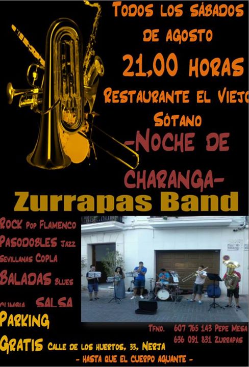 NERJA – De Zurrapas Band Nerja speelt in augustus iedere zaterdagavond in restaurante El Viejo Sótano aan de Calle Los Huertos 33 in Nerja. De avond begint rond 21.00 uur, parkeren kan op het Carabeo-parkeerterrein waarna tegen overleg van het parkeerticket dat bedrag wordt vergoed.