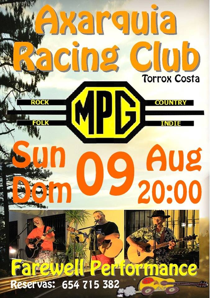 TORROX-COSTA – In bar-restaurant Axarquia Racing Club in Torrox-Costa staat zondagavond 9 augustus een live-optreden gepland van de uit Cómpeta afkomstige band MPG. Deze formatie brengt voornamelijk country-, folk- en rockmuziek ten gehore.