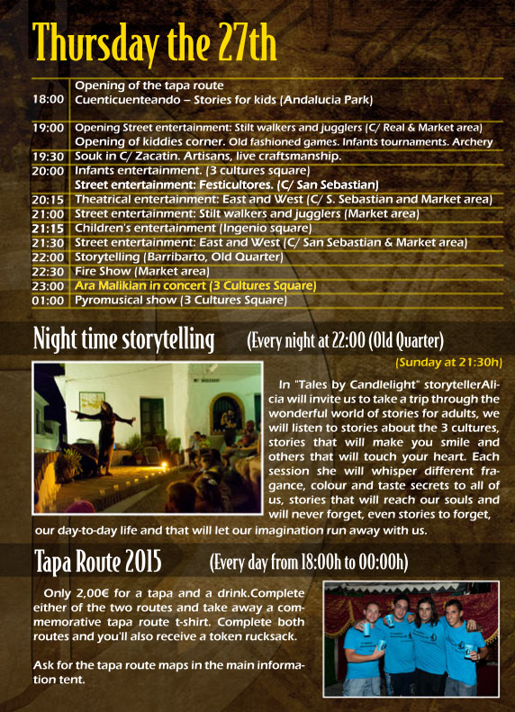 Donderdag 27 augustus wordt om 18.00 uur ook de tapasroute geopend, waarbij bezoekers bij alle deelnemende etablissementen een speciale tapa plus een drankje voor twee euro kunnen kopen. Bij voltooiing van één van de twee tapasroutes komt men bovendien in aanmerking voor een prijs. Om dezelfde tijd is er een Cuenticuenteando, waarbij in het Parque Andalucía verhalen voor kinderen worden voorgedragen.