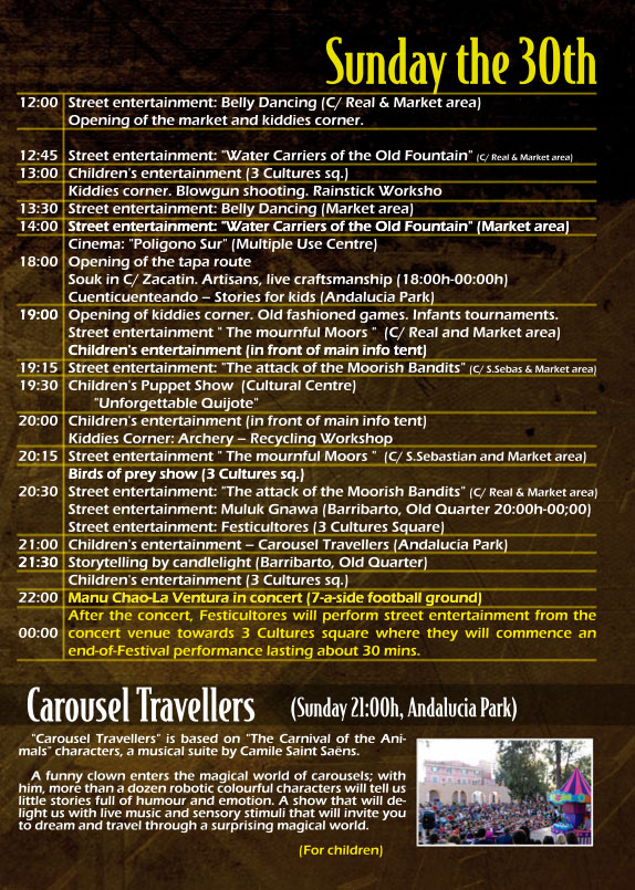 Vanaf 12.00 uur in de middag zijn er allerlei activiteiten tijdens de slotdag van het populaire festival. Zo trekken er diverse straatartiesten door de smalle straten van het bergdorp en is er gedurende de dag vooral voor kinderen van alles te doen. Vanaf 18.00 uur zijn de diverse tapasroutes weer geopend en zijn er her en der door het dorp diverse muziekoptredens en dansshows, ook is er een uitgebreide markt met demonstraties aan oude ambachten te bezoeken.