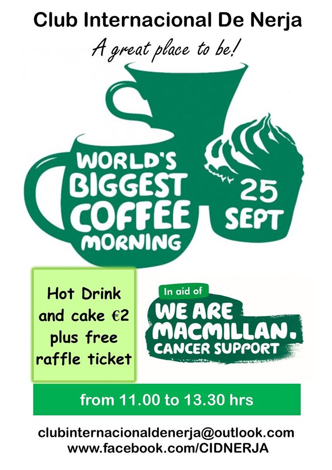 Het evenement vindt plaats bij de Club Internacional de Nerja aan de Calle San Juan 42. Tussen 11.00 en 13.30 uur is daar koffie (of een andere warme drank) met cake verkrijgbaar voor twee euro, welke dus geheel ten goede komen van het Macmillan Cancer Support-project.