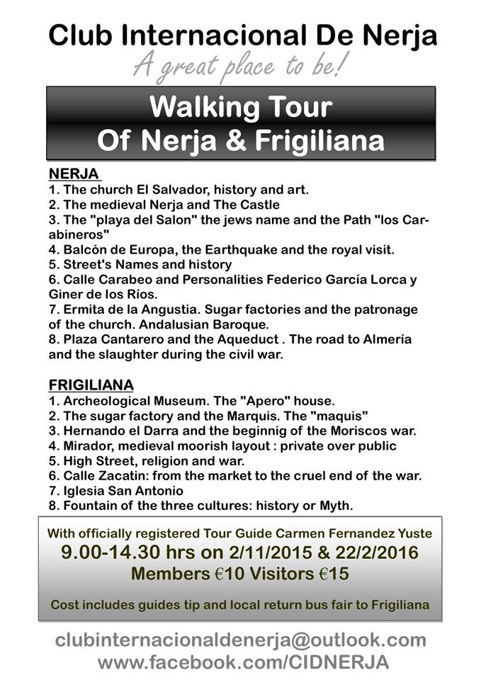 NERJA/FRIGILIANA – De Club Internacional Nerja, een (Engelstalige) sociale en culturele organisatie die zich onder meer bezig houdt met het organiseren van trips vanuit Nerja, heeft voor 2 november van dit jaar en 22 februari volgend jaar excursies uitgezet door Nerja en Frigiliana. De tochten worden gemaakt onder begeleiding van de ervaren gids Carmen Fernandez Yuste, die de deelnemers van informatie voorziet over tal van (historische) bezienswaardigheden die worden bezocht.
