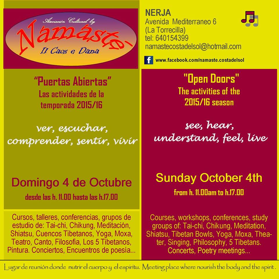 NERJA – Bij de culturele instelling Namasté in Nerja staan er deze week een aantal activiteiten op het programma. Zo is er zondag 4 oktober een open huis onder de naam ‘Puertas Abiertas’, dat begint om 11.00 uur in de ochtend en duurt tot circa 17.00 uur.