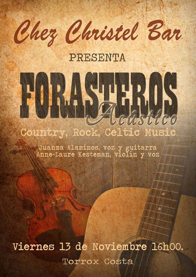 Het akoestische optreden vindt plaats vanaf 16.00 uur. Forasteros bestaat uit Juanma Alaminos (zang en gitaar) en Anne-Laure Kesteman (viool en zang). Chez Christel is te vinden aan de Avenida España, Edf Nautico 12 in Torrox-Costa op zo’n tien kilometer van Nerja aan de kust.