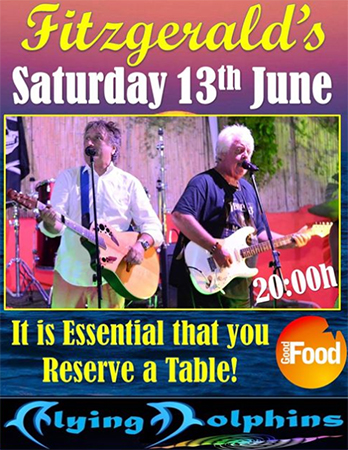 NERJA – De in de Axarquía-regio vermaarde en populaire band The Flying Dolphins treedt zaterdagavond 13 juni op bij Fitzgerald’s Bar, op de hoek van park Verano Azul (Calle Antonio Ferrandis Chanquete) onder het pand van de SuperSol supermarkt in Nerja.