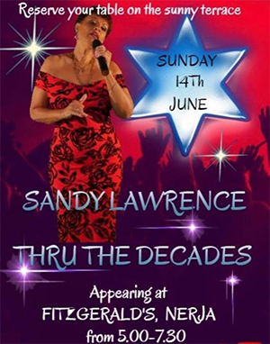 NERJA – Bij Fitzgerald’s Bar, op de hoek van park Verano Azul onder het pand van de SuperSol supermarkt in Nerja , treedt zondagavond 14 juni de zangeres Sandy Lawrence op met haar show ‘Thru the Decades’.