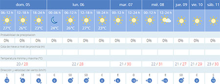 Voor zondag 5 juli en maandag 6 juli voorziet Aemet een gemiddelde dagtemperatuur van 28 graden Celsius, dinsdag en woensdag ligt deze iets boven de grens van 30 graden Celsius in de huidige weersverwachtingen. De wind laat het de komende dagen zo goed als afweten en speelt vanaf woensdag weer mee met een zwakke tot matige bries.