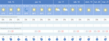 Op vrijdag 17 en maandag 20 juli kan er volgens Aemet af en toe sprake zijn wat (sluier)bewolking, verder regeert de zon in de weersverwachtingen van de meteorologen.