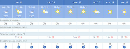 Vrijdag 24 juli is er overdag wel sprake van (zee)mist. Vooral zondag 26 juli lijkt een zonnige dag te worden volgens de meest recente weersvoorspellingen Aemet. De wind laat het de komende dagen vrijwel afweten, waardoor de gemiddelde dagtemperaturen vanaf zondag weer nèt boven de 30 graden Celsius liggen.