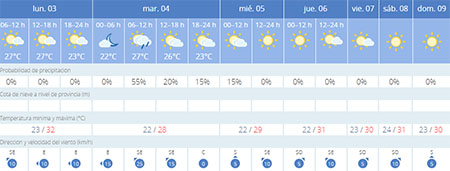 De komende dagen verwacht Aemet vrij veel bewolking op maandag en dinsdag, waarbij er op dinsdagochtend 4 augustus zelfs een kleine kans is op een enkele regenbui. De wind is de komende dagen matig tot zwak.