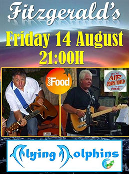 NERJA – De in de Axarquía-regio vermaarde en populaire band The Flying Dolphins treedt vrijdagavond 14 augustus op bij Fitzgerald’s Bar, op de hoek van park Verano Azul (Calle Antonio Ferrandis Chanquete) onder het pand van de SuperSol supermarkt in Nerja.