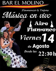 NERJA – De formatie Aire Flamenco treedt vrijdagavond 14 augustus op bij bar El Molino in de binnenstad van Nerja. Het optreden begint rond 22.30 uur.