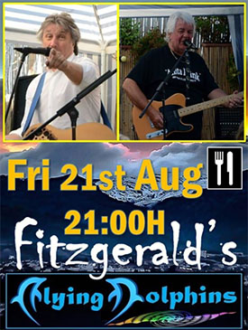 NERJA – De in de Axarquía-regio vermaarde en populaire band The Flying Dolphins treedt vrijdagavond 21 augustus op bij Fitzgerald’s Bar, op de hoek van park Verano Azul (Calle Antonio Ferrandis Chanquete) onder het pand van de SuperSol-supermarkt in Nerja.