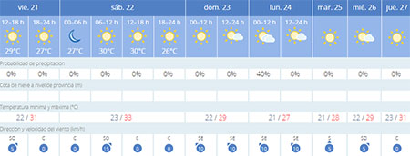 NERJA – De temperaturen rond Nerja schieten zaterdag 22 augustus verder omhoog, naar een gemiddelde waarde van 33 graden Celsius. Dit verwacht de Spaanse meteorologische dienst Aemet (Agencia Estatal de Meteorología) in haar jongste weersvoorspellingen.