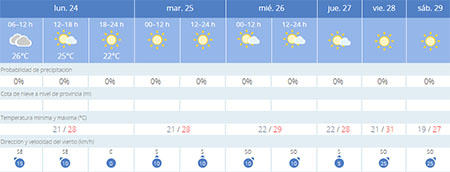 De zon houdt daarbij wel de overhand, al is er met name op maandagochtend 24 augustus af en toe sprake van bewolking. Ook voor woensdag 26 en donderdag 27 augustus voorziet Aemet voorbij drijvende wolkendekken, regen wordt daarbij niet voorzien. Gedurende deze week is er sprake van een matige tot zwakke wind, welke aan het einde van de week in kracht toeneemt.