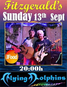 NERJA – De in de Axarquía-regio vermaarde en populaire band The Flying Dolphins treedt zondagavond 13 september op bij Fitzgerald’s Bar, op de hoek van park Verano Azul (Calle Antonio Ferrandis Chanquete) onder het pand van de SuperSol supermarkt in Nerja.