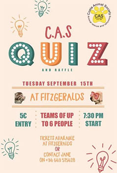 NERJA – Bij Fitzgerald’s Bar in Nerja staat dinsdagavond 15 september een (Engelstalige) quizavond op het programma, waarbij de opbrengsten ten goede komen aan de dierenstichting Costa Animal Society (CAS).