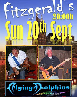 NERJA – De in de Axarquía-regio vermaarde en populaire band The Flying Dolphins treedt zondagavond 20 september op bij Fitzgerald’s Bar, op de hoek van park Verano Azul (Calle Antonio Ferrandis Chanquete) onder het pand van de SuperSol-supermarkt in Nerja.