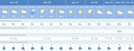 Van neerslag is in de komende week volgens Aemet geen sprake. De wind laat het in de voorspellingen in het begin van de week afweten. Deze neemt vanaf donderdag in kracht toe.