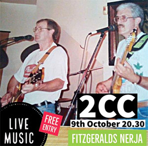 NERJA – De band 2CC treedt vrijdag 9 oktober op bij Fitzgerald’s Bar, op de hoek van het park Verano Azul (Calle Antonio Ferrandis Chanquete) onder het pand van de SuperSol-supermarkt in Nerja.