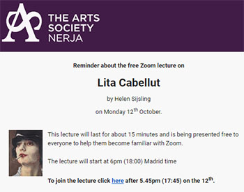 NERJA – Bij de Arts Society Nerja kan op maandag 12 oktober via internet een Engelstalige lezing worden bijgewoond. Deze wordt verzorgd door Helen Sijsling en gaat over de Spaans kunstenares Lita Cabellut. De lezing begint om 18.00 uur.