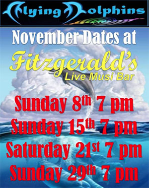De band treedt in november elk weekeinde op bij Fitzgeralds’s. De optredens beginnen telkens om 19.00 uur en duren tot circa 22.00 uur, de toegang is vrij. The Flying Dolphins staan geprogrammeerd op de zondagen 8 en 15 november, zaterdag 21 november en zondag 29 november. Gezien de beperkte capaciteit in verband met het Corona-virus én de verwachte drukte is raadzaam om vooraf een tafel te reserveren.