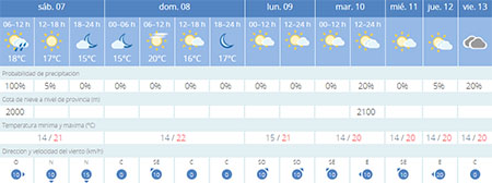 Neerslag is daarbij zowel dit weekeinde als de komende week niet te verwachten volgens de meteorologen. Dit stelt het weerstation Aemet (Agencia Estatal de Meteorología) in haar meest recente weersvoorspellingen. De temperaturen schommelen daarbij iets boven de twintig graden Celsius, de wind neemt aanzienlijk af.