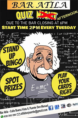 Dit is een vervanger van de wekelijkse quiz-night, die door de huidige Corona-perikelen en de daarbij behorende verplichte sluitingstijd van 18.00 uur is komen te vervallen. De quiz-afternoon begint dinsdag rond 14.00 uur, bar Atila is te vinden aan de Calle Buena Vista 9 in Puente Don Manuel. Vooraf reserveren is noodzakelijk, dit kan telefonisch via het nummer 0034 663 393 687 of via e-mail: atilabarpuente@gmail.com.