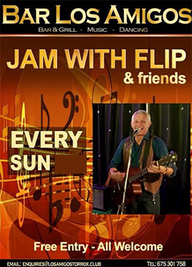TORROX – In bar Los Amigos (Torrox) staat zondagmiddag 29 november een jamsessie gepland onder leiding van de de Britse gelegenheidsband ‘Flip & Friends’. De muzikale middag begint om circa 14.00 uur.