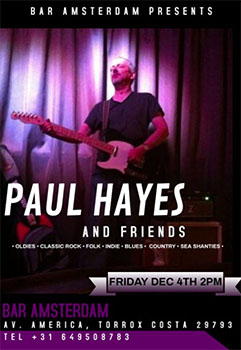 TORROX – In de kustplaats Torrox, op circa tien kilometer van Nerja gelegen, treedt vrijdagmiddag 4 december de zanger/gitarist Paul Hayes op. Dit gebeurt bij Bar Amsterdam aan de Avenida America in Torrox-Costa.