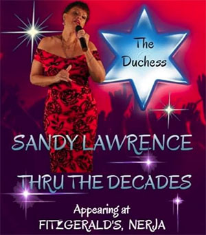 NERJA – Bij Fitzgerald’s Bar, op de hoek van het park Verano Azul onder het pand van de Super Sol-supermarkt in Nerja, treedt vrijdagmiddag 18 december de zangeres Sandy Lawrence op.