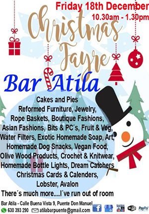 Bar Atila is te vinden aan de Calle Buena Vista 9 in Puente Don Manuel. De kerstmarkt begint om 10.30 uur en duurt tot circa 13.30 uur.