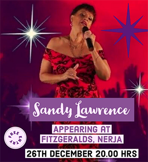 NERJA – Bij Fitzgerald’s Bar, op de hoek van park Verano Azul onder het pand van de SuperSol-supermarkt in Nerja , treedt zaterdagavond 26 december de zangeres Sandy Lawrence op.