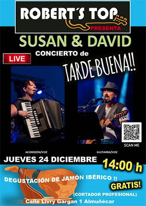 ALMUNECAR – In bar/restaurant Robert’s Top in Almuñécar staat donderdag 24 december een optreden geprogrammeerd van het duo Susan & David. Het optreden begint rond 14.00 uur en is gratis toegankelijk.