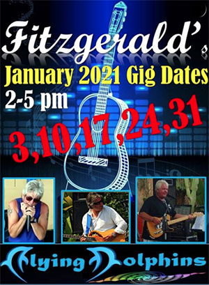 NERJA – De in de Axarquía-regio vermaarde en populaire band The Flying Dolphins treedt in januari 2021 iedere zondag op bij Fitzgerald’s Bar, op de hoek van park Verano Azul (Calle Antonio Ferrandis Chanquete) onder het pand van de SuperSol-supermarkt in Nerja.