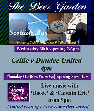 NERJA – De gitaristen ‘Booze’ en ‘Captain Eric’ treden donderdagavond 31 december op bij bar/restaurant The Beer Garden. De Schotse bar is gevestigd aan de Avenida Mediterraneo 1 in Nerja.