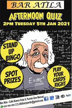 De zogeheten quiz-afternoon begint dinsdag rond 14.00 uur, bar Atila is te vinden aan de Calle Buena Vista 9 in Puente Don Manuel. Vooraf reserveren is in verband met de beperkte capaciteit vanwege het Corona-virus noodzakelijk, dit kan telefonisch via het nummer 0034 663 393 687 of via e-mail: atilabarpuente@gmail.com.