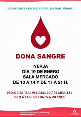 Mensen die bloed willen doneren kunnen tussen 10.00 en 14.00 uur en van 17.00 tot 21.00 uur terecht in de Sala Mercado aan het Plaza de la Ermita van Nerja. Het vooraf maken van een afspraak is daarbij noodzakelijk, dit kan op werkdagen tussen 09.00 en 14.00 uur via de telefoonnummers +34 951 034 120 óf +34 951 034 121. Meer info is te vinden op de website www.donantesmalaga.org.
