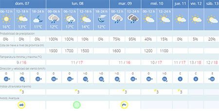 Daarbij worden vlagen met windkracht zeven (harde wind) verwacht, terwijl de golven voor de kust een hoogte kunnen bereiken van drie meter. Regen is daarbij niet voorzien, dit is het wel het geval voor zondagnacht, maandag en dinsdag. De temperaturen halen daarbij voor de komende dagen een gemiddelde maximale waarde van 17 graden Celsius.
