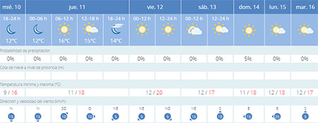 Donderdag 18 maart haalt het kwik een gemiddelde dagwaarde van 18 graden Celsius, voor vrijdag 19 maart wordt zelfs een gemiddelde dagtemperatuur van 20 graden Celsius voorspeld door de meteorologen van Aemet. Op vrijdag en zondag regeert voornamelijk de zon, op zaterdag en in het begin van de komende week zal er volgens de voorspellingen van de weerkundigen sprake zijn van voorbijdrijvende wolkendekken.