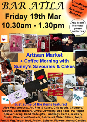 Bar Atila is te vinden aan de Calle Buena Vista 9 in Puente Don Manuel. De markt begint om 10.30 uur en duurt tot circa 13.30 uur. Op de Artisan Market worden allerlei handgemaakte artikelen, sierraden en voedsel te koop aangeboden.