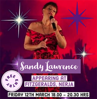 NERJA – Bij Fitzgerald’s Bar, op de hoek van park Verano Azul onder het pand van de Super Sol-supermarkt in Nerja , treedt vrijdagavond 12 maart de zangeres Sandy Lawrence op.