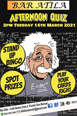 De zogeheten quiz-afternoon begint dinsdag rond 14.00 uur, bar Atila is te vinden aan de Calle Buena Vista 9 in Puente Don Manuel. Vooraf reserveren is in verband met de beperkte capaciteit vanwege het Corona-virus noodzakelijk, dit kan telefonisch via het nummer 0034 663 393 687 of via e-mail: atilabarpuente@gmail.com.