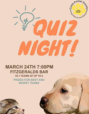 NERJA – Bij Fitzgerald’s Bar in Nerja staat woensdagavond 24 maart een (Engelstalige) quizavond op het programma, waarbij de opbrengsten ten goede komen aan de dierenstichting Costa Animal Society (CAS).