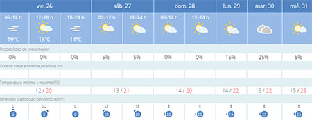 Een en ander blijkt uit de meest recente weersvoorspellingen van het weerstation Aemet (Agencia Estatal de Meteorología). Voor de komende dagen worden temperaturen verwacht met een gemiddelde dagwaarde van circa 20 graden Celsius, na het weekeinde lopen deze nog iets verder op. De zon wordt dit weekeinde en komende week vooral in de ochtenduren aan het oog onttrokken door wolkendekken, zo voorzien de meteorologen.