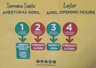 NERJA – De supermarktketen Mercadona heeft voor deze week (Semana Santa, de ‘heilige’ week rond Pasen) de openingstijden aangepast. De beide vestigingen in Nerja zijn donderdag 1 april tot 15.00 uur geopend, op vrijdag 2 april (Goede Vrijdag, Viernes Santo) en zondag 4 april (Pasen, nationale feestdag) zijn deze winkels gesloten.