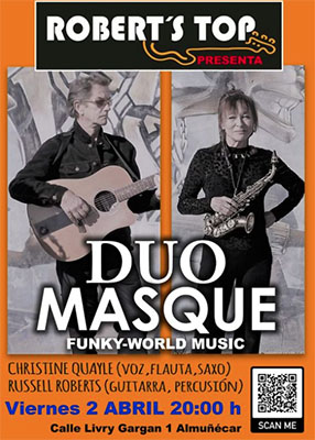 ALMUNECAR – In bar/restaurant Robert’s Top in Almuñécar staat vrijdagvond 2 april een optreden geprogrammeerd van het Duo Masque. Het optreden begint rond 20.00 uur.