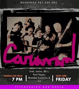 NERJA – De Ierse band Caravan treedt vrijdag 2 april op bij Fitzgerald’s Bar, op de hoek van park Verano Azul (Calle Antonio Ferrandis Chanquete) onder het pand van de SuperSol-supermarkt in Nerja.