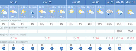 Daarin voorspelt Aemet gemiddelde dagtemperaturen van circa 20 graden Celsius en voor de komende dagen veel wolkendekken, waardoor de zon zich slechts sporadisch laat zien boven Nerja en omgeving. Aan het einde van de week is daarbij ook een (geringe) kans op neerslag. De wind laat het deze week grotendeels afweten terwijl de temperaturen in de loop van de week iets teruglopen.