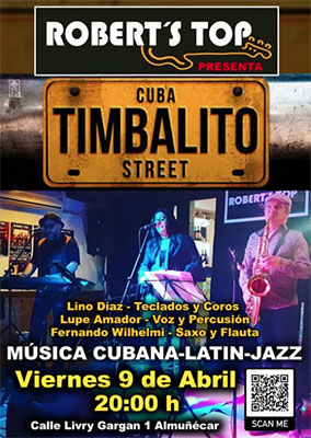 ALMUNECAR – Bij bar/restaurant Robert’s Top in Almuñécar staat vrijdagvond 9 april een optreden geprogrammeerd van de band Timbalito Street. Het optreden begint rond 20.00 uur en duurt circa twee uur.